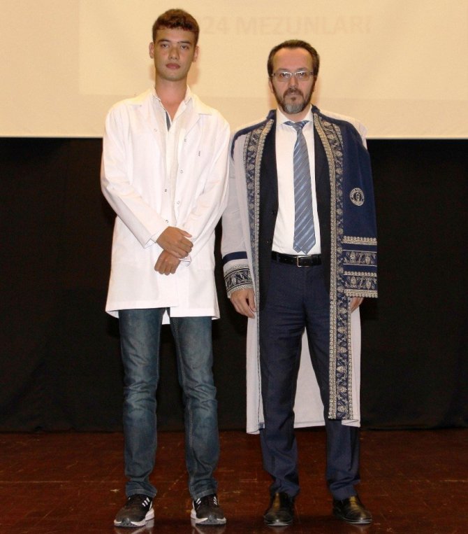 Konuşmasının ardından Rektör Prof. Dr. Cavit Bircan, 2018 yılı ÖSYM sınavında 5337. olarak Tıp Fakültemize ilk sırada giren öğrenci Mehmet Zahid Özdemir’e beyaz önlüğünü giydirdi. Törende diğer öğrencilere beyaz önlükleri, Rektör Yardımcıları, Dekanlar ve akademisyenler tarafından giydirildi.