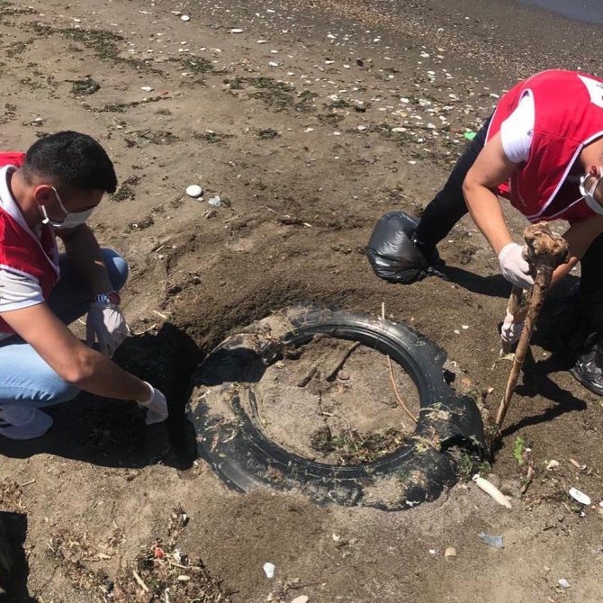 DÜZCE(İHA) – Kızılay Genç Gönüllüleri Karadeniz sahilinde çöp topladılar. Sahilde çıkan araç lastiği ise gençleri şaşırttı.