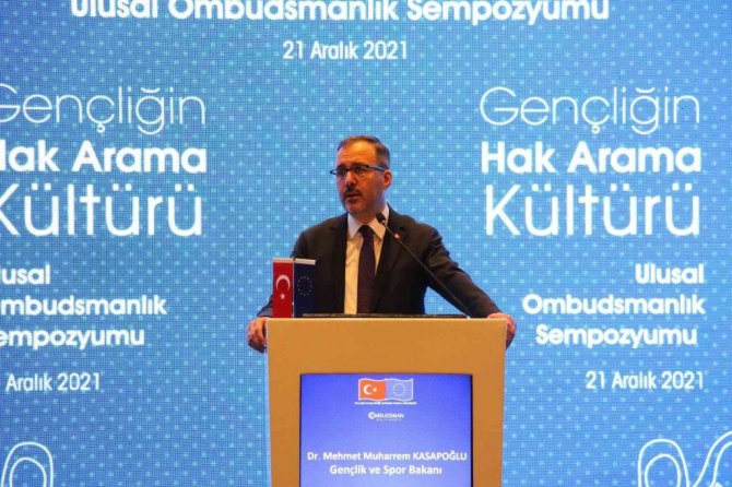 Gençlik ve Spor Bakanı Mehmet Kasapoğlu, Kamu Denetçiliği Kurumu tarafından Ankara'da bir otelde düzenlenen "Gençliğin Hak Arama Kültürü" temalı Ulusal Ombudsmanlık Sempozyumu'na katıldı. Avrupa Birliği ile ortak yürütülmekte olan "İnsan Haklarının Korunması ve Tanıtılmasında Kamu Denetçiliği Kurumunun Rolünün Güçlendirilmesi için Teknik Destek Projesi" kapsamında düzenlenen sempozyumda, üniversitelerin Ombudsmanlık Kulüpleri, gençlik STK'ları, akademisyenler ve ilgili kamu kurumlarının temsilcileri, gençlerin hak arama kültürünü ele aldı. Ayrıca Türkiye'deki hak arama yolları ile gençlerin adalet, insan hakları ve hakkaniyet konusundaki görüşleri değerlendirildi.