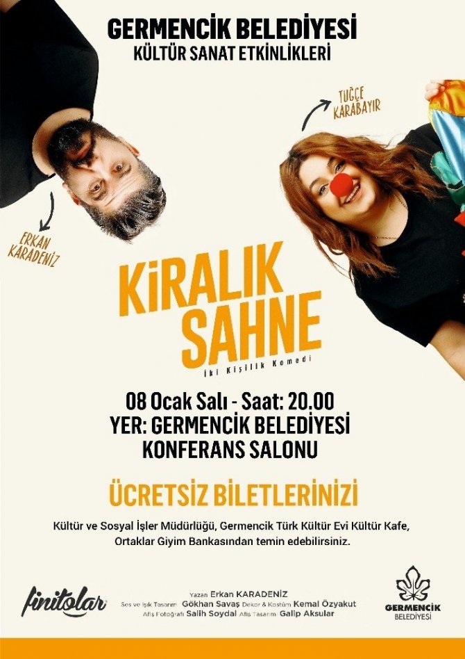 Germencik Belediyesi tarafından ücretsiz olarak düzenlenen tiyatro gösterisinin 08 Ocak 2019 günü saat 20.00’de Germencik Belediyesi Konferans Salonunda gerçekleşeceği, oyun için ise ücretsiz biletlerin Germencik Belediyesi Kültür ve Sosyal İşler Müdürlüğü, Kültür Kafe, Ortaklar Giyim Bankasından temin edilebileceği belirtildi.