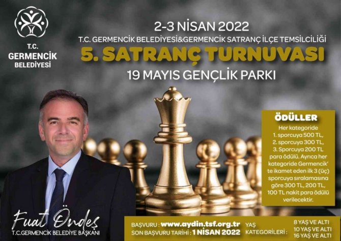 Sosyal medya üzerinde paylaşım yapan Başkan Öndeş, paylaşımında "Belediyemiz ve Germencik Satranç İlçe Temsilciliği katkılarıyla 2-3 Nisan 2022 tarihlerinde 19 Mayıs Gençlik Parkında gerçekleşecek olan 5. Satranç Turnuvasına tüm satrançseverleri bekliyoruz. 8 yaş ve altı, 10 yaş ve altı ile 16 yaş ve altı olmak üzere 3 kategoride gerçekleşecek olan turnuva için bu kriterlere uygun satranç sporcularımız son başvuru tarihi olan 1 Nisan 2022 tarihine kadar www.aydin.tsf.org.tr adresine online başvuru yapabilirler" ifadelerine yer verdi.