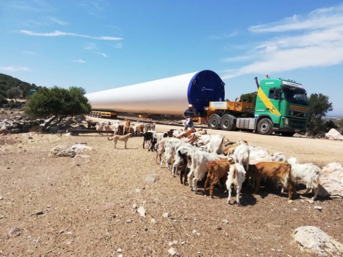 İzmir'in Çeşme ilçesinde, RES inşaatı ile ilgili yargı süreci devam ederken tırlar ile inşaat alanına türbin gövdeleri ve kanat aksamlarının getirilmesi,...