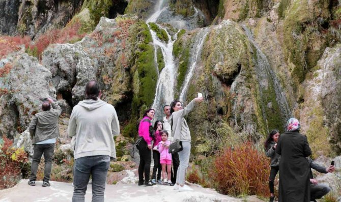 Kış mevsimine sayılı günler kala yüksekten dökülen suları hem de çevresindeki farklı tonlara bürünen bitki örtüsüyle ilgi gören şelalenin çevresindeki ağaçlar şu sıralar sarı, turuncu ve yeşilin farklı tonlarına büründü.