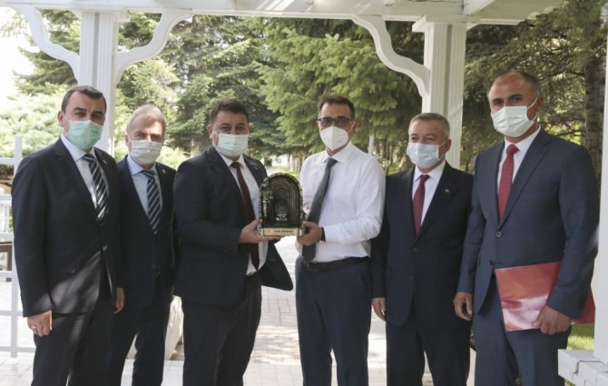 Görüşme sonunda GMİS Genel Başkanı Hakan Yeşil, Bakan Dönmez'e maden ocağı figürlü bir heykel ile Madenci Bastonu takdim etti.