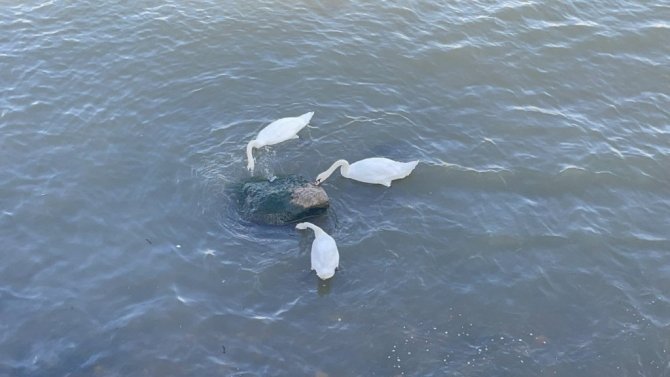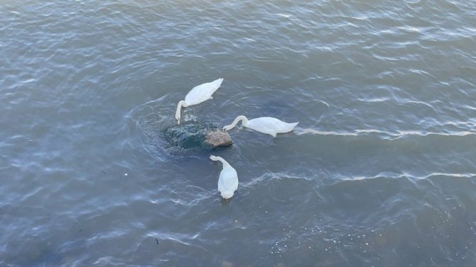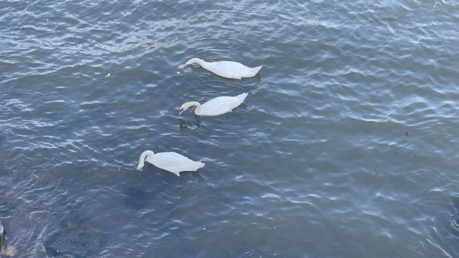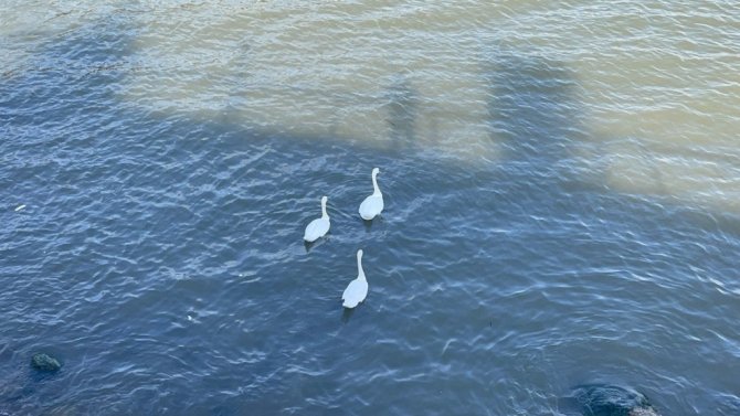 Soğuk bölgelerden sıcak iklimlere göç eden kuğular, Ordu'nun Fatsa ilçesi sahillerinde mola verdi.