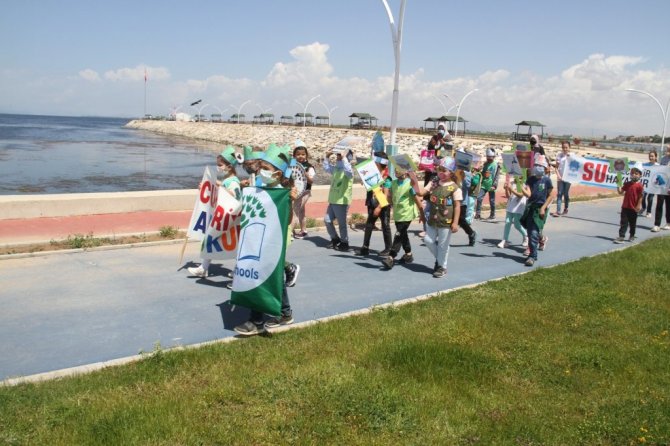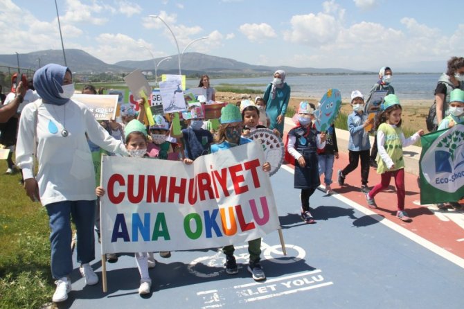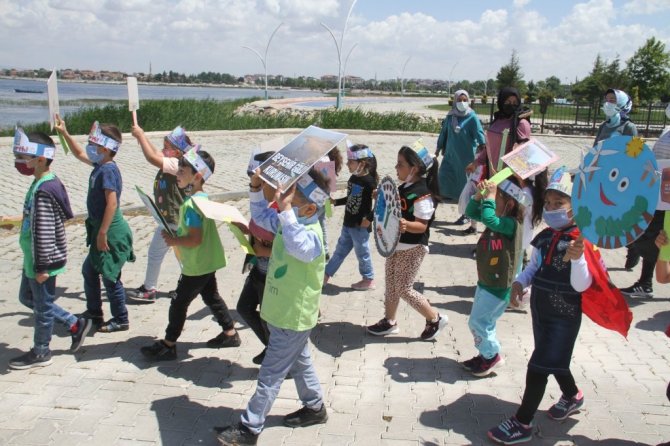 Konya'nın Beyşehir ilçesinde anaokulu öğrencileri, göl kıyısındaki Vuslat Parkı'nda düzenlenen etkinlikte yaptıkları yürüyüşle büyüklerine "Beyşehir Gölü'ne sahip çık" mesajı verdi.