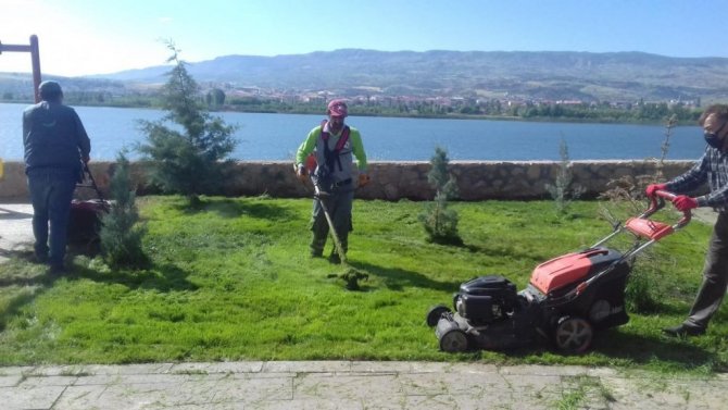 Adıyaman'ın Gölbaşı ilçesinde yeşil alanlarda bakım çalışmaları devam ediyor.