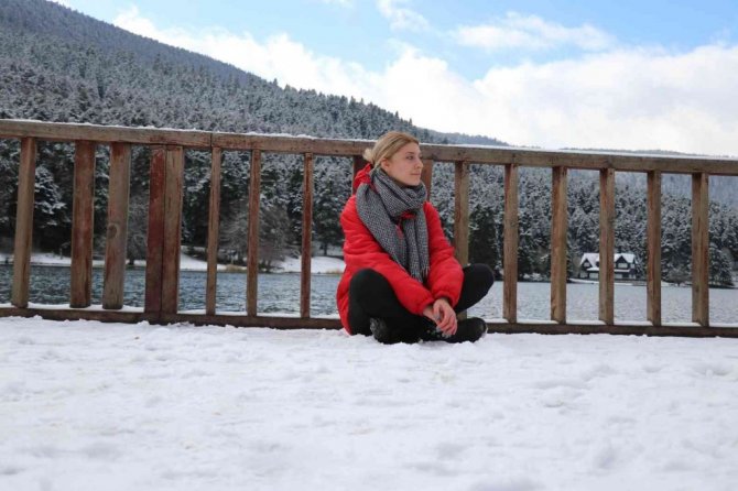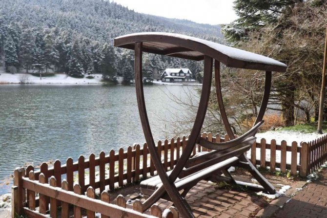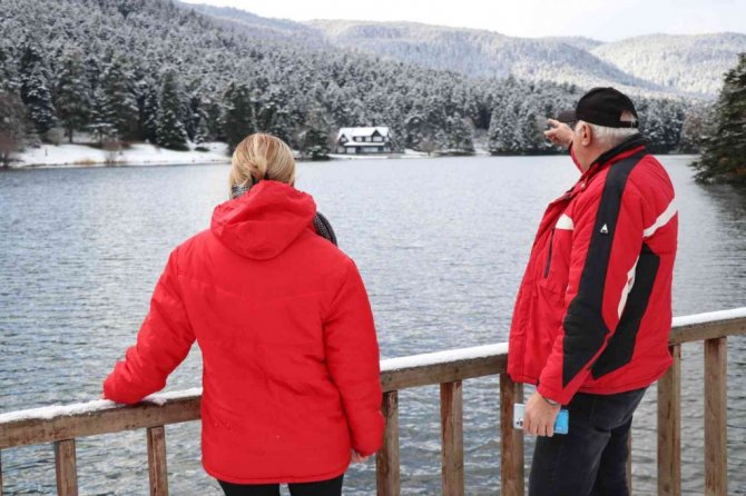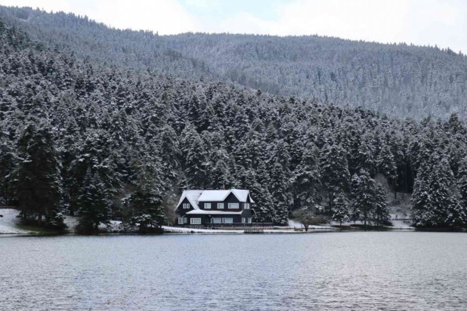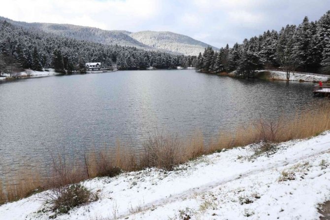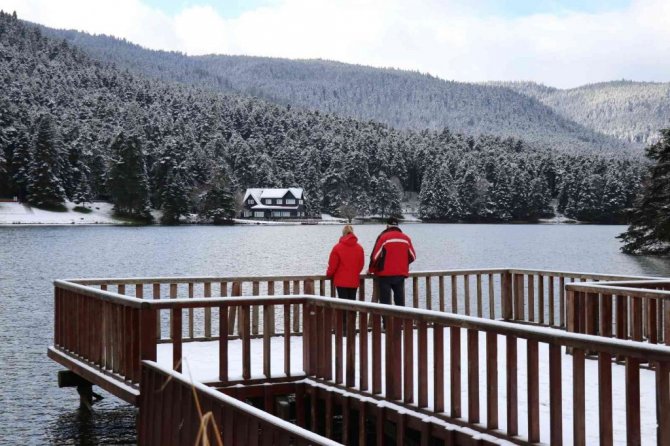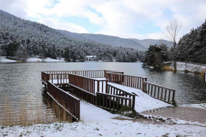 Bolu'nun gözde turizm merkezi Gölcük Tabiat Parkı'nda yeşil alanlar kar yağışıyla birlikte beyaz örtüyle kaplandı.