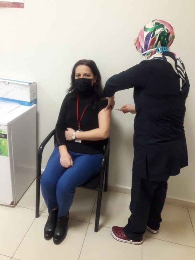 14 Ocak'ta aşının ilk dozu uygulanan Gönen Devlet Hastanesi'ndeki sağlık çalışanlarına 2. doz aşılama bu sabah başladı.