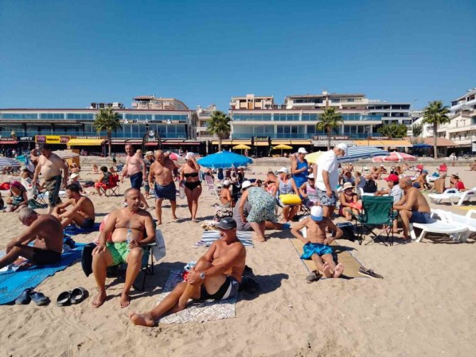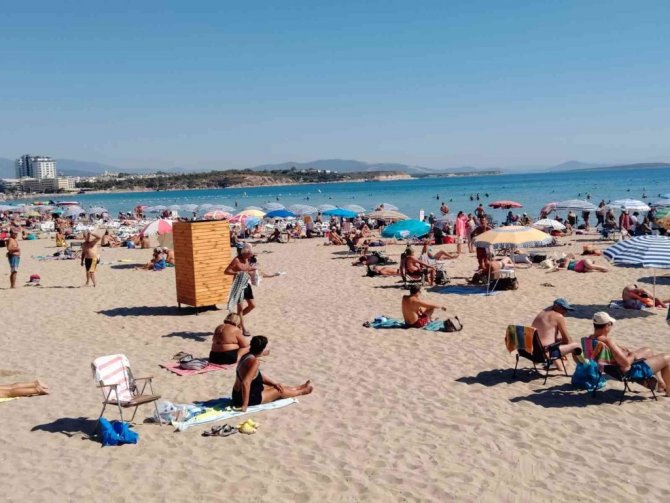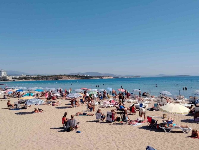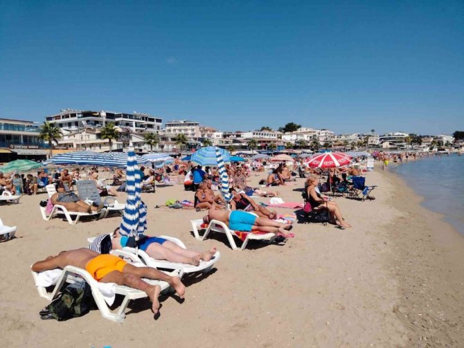 Aydın'ın Didim ilçesinde Ekim ayında hava sıcaklıkları mevsim normallerinin üzerinde seyrederken, dünyaca ünlü Altınkum Plajı da güneşin ve denizin tadını çıkarmak isteyenler ile dolup taştı.
