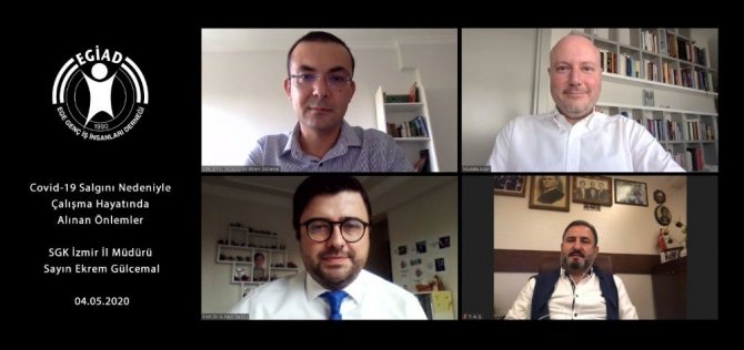 Dünyayı etkisi altına alan korona virüs, alınması gereken birçok tedbiri de beraberinde getirdi. İnsanlar vakaların artmasıyla birlikte kişisel önlemlerini almaya, kalabalık ve sosyalleşmeyi gerektiren ortamlardan uzak durmaya başlarken, ardı ardına gelen resmi önlemler ise gecikmedi. Bu süreçte birçok kuruluş, cafe, restoran, gece kulüpleri, sinema ve tiyatrolar kapatılırken camilerde cemaatle kılınan namazlar, bakanlığın almış olduğu kararla geçici bir süreliğine durduruldu. Ayrıca birçok kurum salgının daha fazla yayılmasını önlemek amacıyla evden çalışma düzenine geçti. Korona virüs salgını, tüm dünyada ve Türkiye İstatistik Kurumu (TÜİK) verilerine göre yaklaşık 28 milyon istihdamın bulunduğu Türkiye’de işverenlerin de temel endişesi haline gelmiş durumda. Konuyu ayrıntılı bir şekilde değerlendirmek amacında olan EGİAD, “Çalışma Hayatında Alınan Önlemler” konulu bir Webinar gerçekleştirerek, detaylı bilgi almak üzere SGK İzmir İl Müdürü Ekrem Gülcemal’i online konuk etti.