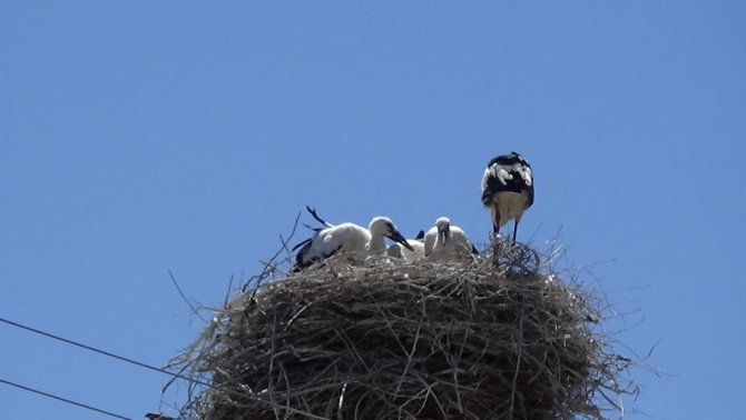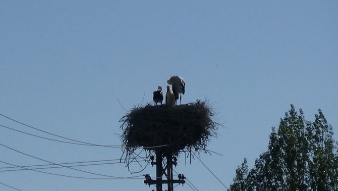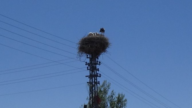 Kars'ta elektrik direğinde yuvasını kuran ve geçen yıl yavruları ölen Gülgez leylek bu kez yavrularını büyütmeyi başardı.