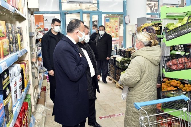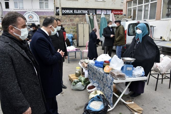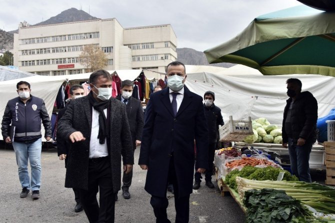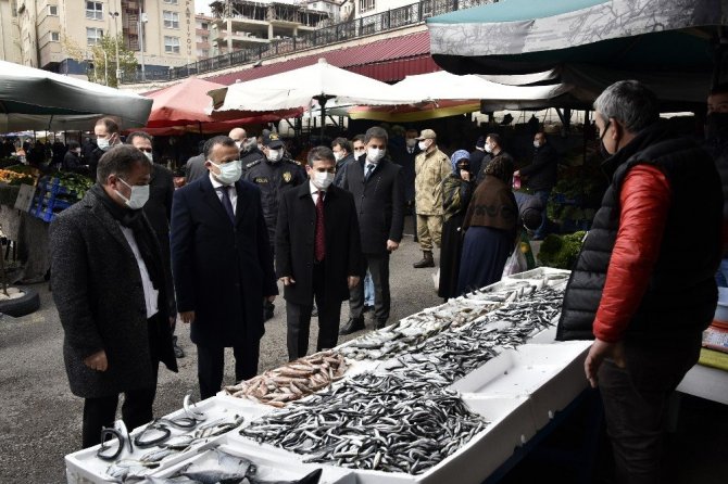 “Sağlık İçin Hepimiz İçin” sloganıyla yapılan denetleme faaliyeti kapsamında Belediye Başkanı Ercan Çimen ve diğer yetkililerle 15 Temmuz Zafer Meydanında kurulu salı pazarında incelemelerde bulunan Vali Taşbilek hem vatandaşlara hem pazar esnafına maske, mesafe, temizlik kurallarını hatırlattı, misafirliğe gitmemeleri ve misafir kabul etmemeleri noktasında uyardı.