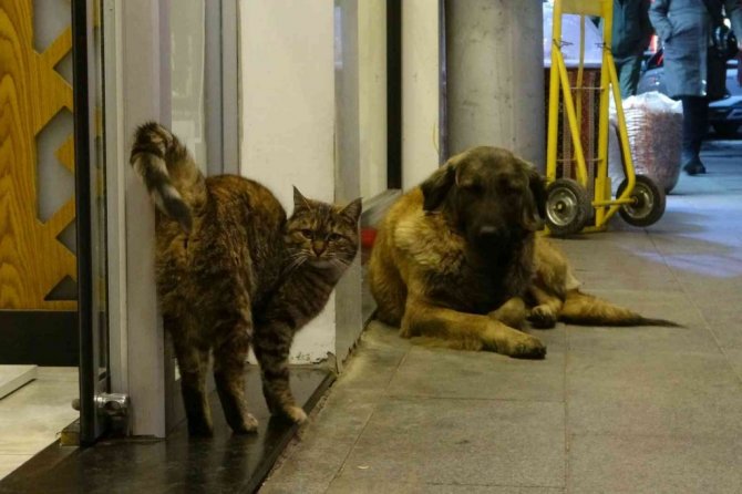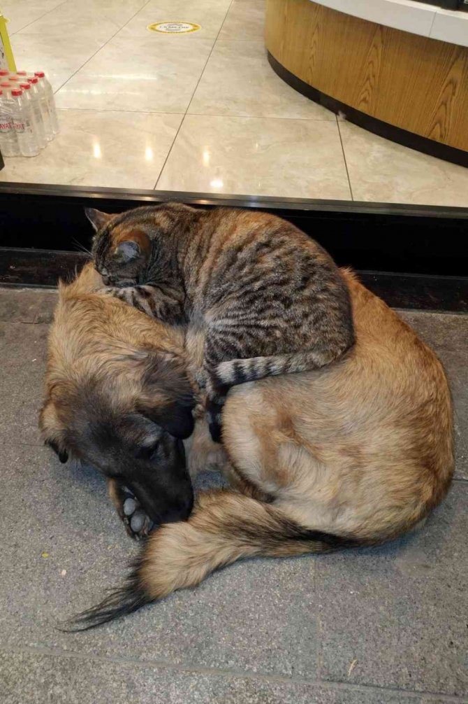 Doğaları gereği birbirlerine düşman olarak gösterilen kedi ve köpeğin yakınlaşması cadde üzerinden geçen vatandaşları hem şaşırtıyor hem de ilgilerini çekiyor.