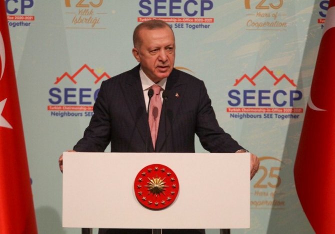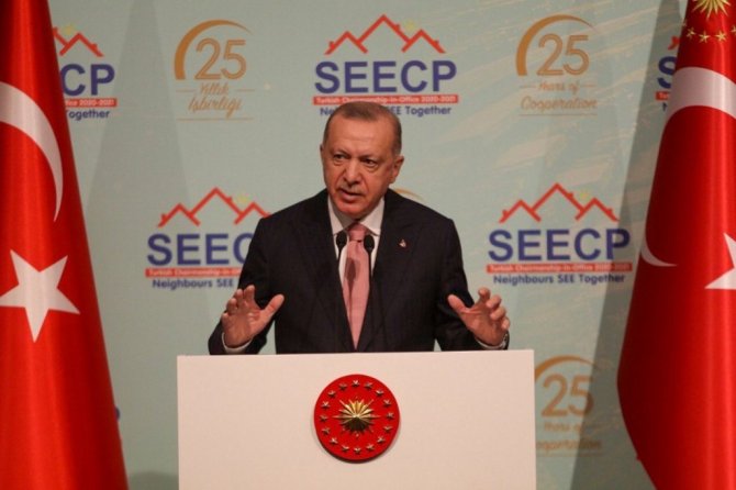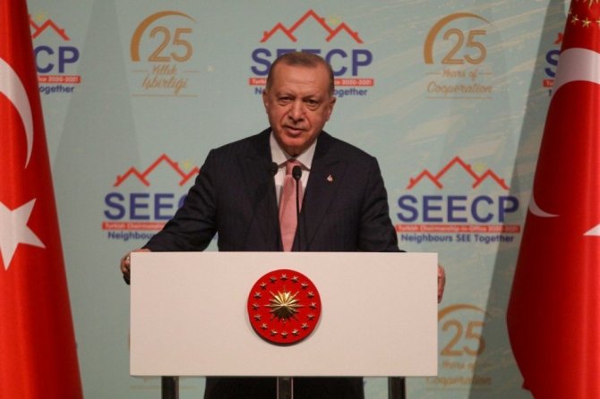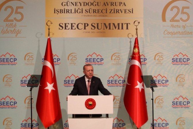 Cumhurbaşkanı Recep Tayyip Erdoğan, Antalya'nın Belek Turizm Merkezi'ndeki NEST Kongre Merkezi'nde düzenlenen Güneydoğu Avrupa İşbirliği Süreci (GDAÜ)Zirvesi kapsamında düzenlenen basın toplantısında konuştu. Bugün bölgenin barış ve istikrarı adına önemli bir toplantı için Antalya'da bulunarak, burada samimi bir ev sahipliğini gerçekleştirdiklerini söyledi. Türkiye'nin dönem başkanlığını 3. defa üstlendiği Güneydoğu Avrupa İşbirliği Süreci Zirve Toplantısı'nı tamamladıklarını dile getiren Erdoğan, "Zirvemizde alınan kararların ülkelerimiz ve Avrupa halkları için hayırlara vesile olmasını diliyorum. Toplantıya iştirak eden tüm dostlarımıza katılımları ve değerli katkıları için şükranlarımı bildiriyorum. Bu yıl aynı zamanda örgütümüzün 25. yıl dönümünü kutluyoruz. GDAÜ İşbirliği Süreci aradan geçen çeyrek asırda çok önemli mesafeler kat etti. Süreç kuruluşundan bu yana geçen zamanda katılımcı ülkelerin bir araya geldiği, meselelerini açık yüreklilikle konuştuğu bir platforma dönüştü. 7 ülke ile başladığımız yolculuğu bugün 13 katılımcıyla çok daha kararlı bir şekilde sürdürüyoruz. İşbirliği sürecinin kuruluş gayesini yerine getirmesini görmekten büyük bir bahtiyarlık duyuyoruz" diye konuştu.