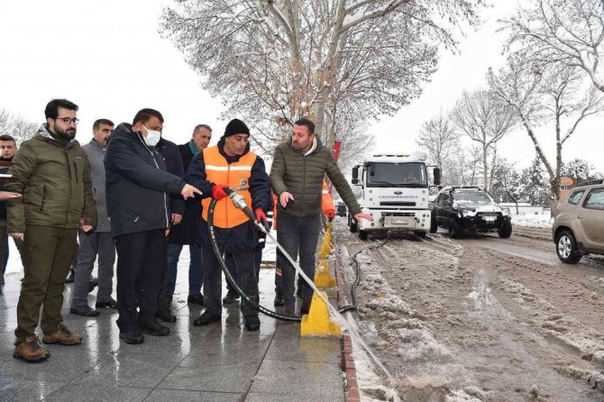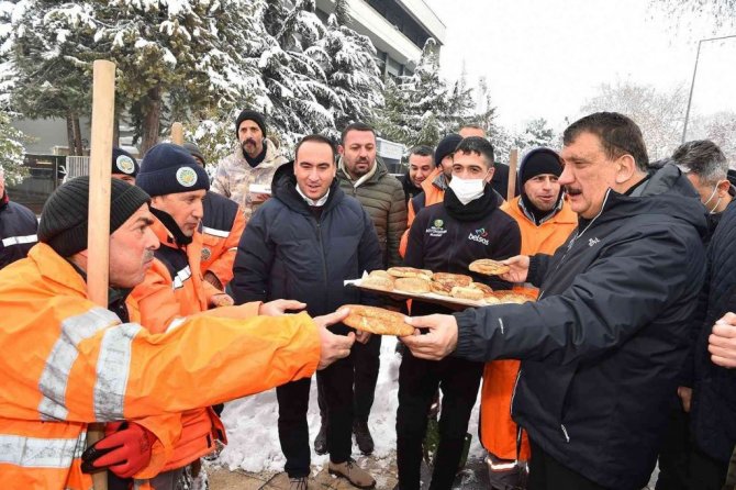 Malatya Büyükşehir Belediye Başkanı Selahattin Gürkan, Malatya'ya karın yağdığı ilk andan itibaren sahada çalışmalarını 7-24 esasına göre sürdüren Büyükşehir Belediye ekiplerini ziyaret ederek, personellere çeşitli ikramlarda bulundu.