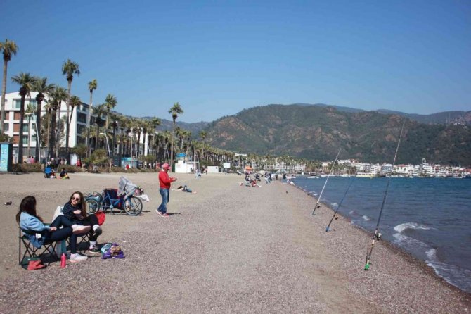 Marmaris'te hafif rüzgar olmasına rağmen güneşli ve ılık hava vatandaşların sandalye masalarını alıp sahile gelmesine neden oldu. Oltaları ile denizde balık tutan vatandaşlar ise balığın olmamasından şikayetçi olurken havanın güzel olmasına sevindiklerini belirtti.