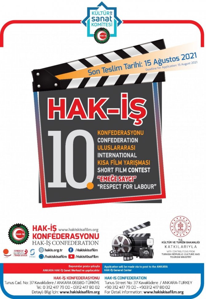 HAK-İŞ'in Kültür ve Turizm Bakanlığı'nın katkılarıyla gerçekleştirdiği Kısa Film Yarışması başvuruları, 15 Ağustos 2021 tarihinde sona erecek. Yarışma kapsamında ulusal ve uluslararası alanda iki kategoride 11 dalda toplam 60 bin TL'nin üzerinde ödül verilecek.
