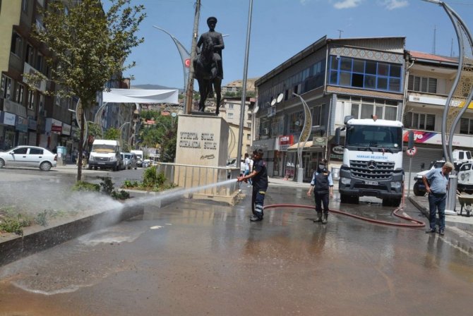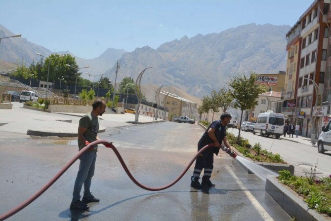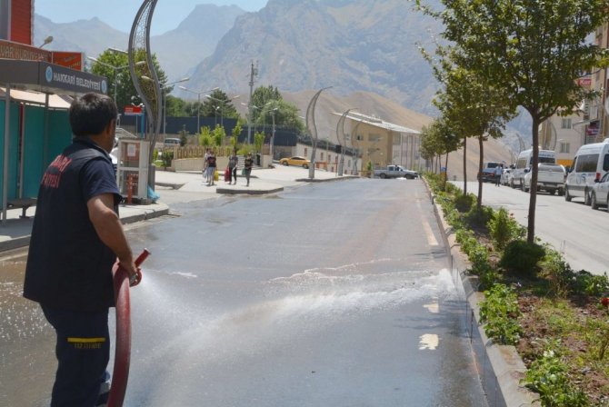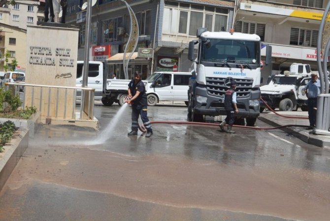 Hakkari Belediyesi ekipleri tarafından refüjdeki çiçek dikme çalışmalarının ardından caddeler tazyikli suyla yıkandı.