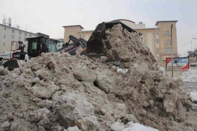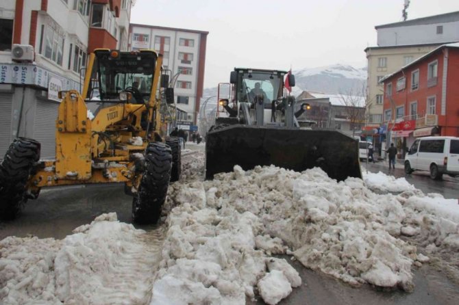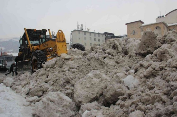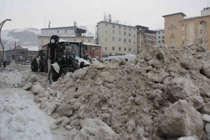 Hakkari çarşı merkezinde biriken kar yığınları belediye ekipleri tarafından kamyonlarla kent dışına çıkartılmaya başlandı.