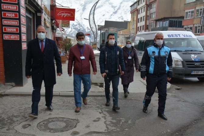 Aile, Çalışma ve Sosyal Hizmetler Hakkâri İl Müdürü Salih Kaya ve beraberinde bulunan emniyet, sağlık, tarım özel, il özel idare ve belediye ekipleri de denetimlerini aralıksız olarak sürdürüyor. Tüm iş yerlerini tek tek denetleyen kurum amirleri; maske, sosyal mesafe ve hijyen kurallara dikkat edilmesi uyarısında bulundu. Çarşı merkezinde maskesini çene kısmına takan vatandaşları da uyaran denetim ekibi, sigara içenleri ise uyararak kent merkezinin değişik noktalarında sigara içmenin yasak olduğunu söylediler.