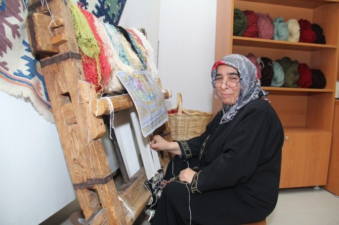 Halı dokumaya 7 yaşında başlayan ve 25 yaşına kadar dokumaya devam eden 65 yaşındaki Fatma Seçer, “Köyden şehre geldiğimiz için halı dokuyamadım. 1 sene önce Raziye hoca ile tanıştım ve halı dokumaya yeniden başladım. Hem aile bütçeme katkısı oluyor hem de psikolojik olarak beni rahatlatıyor. Büyükelçilik için özel bir halı dokuyorum. 20’ye 25 santim ebatlarında ipek bir halı dokuyorum. 650 bin düğüm var. Bittiğinde Meryem ana tablosu olacak” dedi.