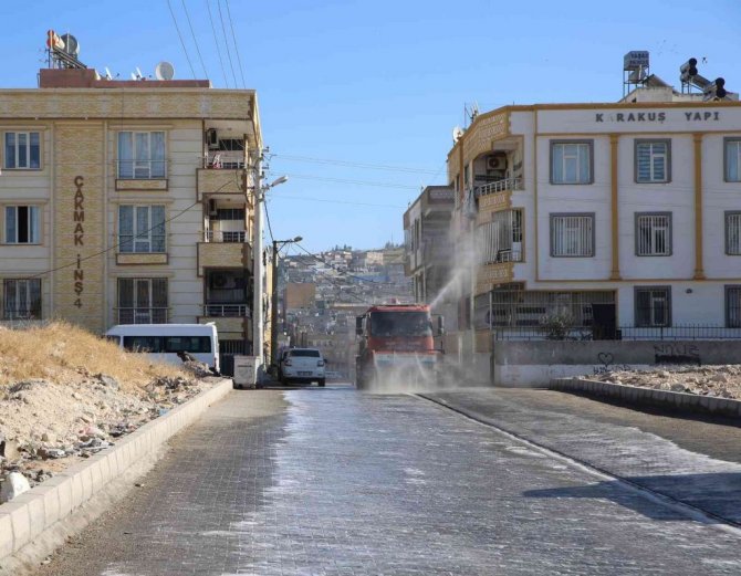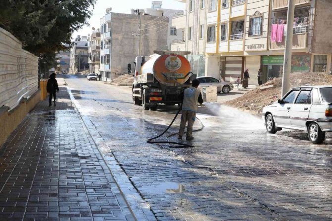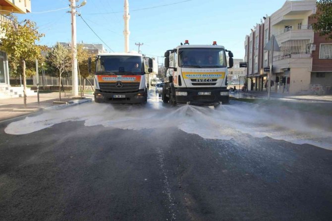 Haliliye Belediyesi ilçe genelinde temizlik çalışmalarını titizlikle sürdürürken, Devteşti Mahallesinde bulunan cadde, sokak ve kaldırımlar köpüklü su ile yıkandı.