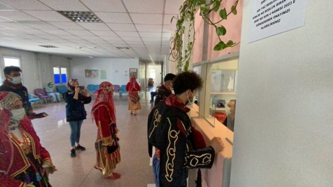 Afyonkarahisar'ın Bolvadin ilçesinde halk oyunları ekibi, yöresel kıyafetlerini giyerek hastaneye aşı olmaya geldiler.