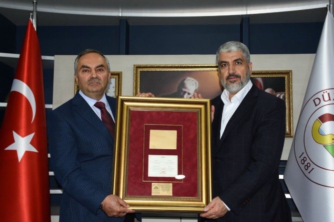 Konuşmaların ardından Düzce Belediye Başkanı Dursun Ay tarafından tablo hediye edilen HAMAS Siyasi Büro Başkanı Halid Meşal de Filistin tapusunun küçültülmüş bir örneğinin bulunduğu tabloyu hediye etti.