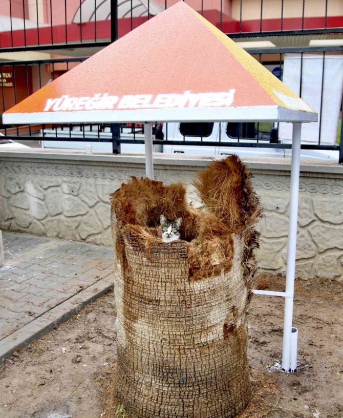 Yüreğir Anadolu Lisesi'ne kapı yenileme ve basket potası montajı kurulumuna giden Yüreğir Belediyesi ekipleri, bahçede zamanla çürüyen palmiye ağacının gövdesine yuva yapan hamile kediyi fark etti. Yağan yağmurda ıslanan kediye önce geçici gölgelik yapan ekipler daha sonra şantiyede hazırladıkları çatıyı yuvanın üzerine kurdu.