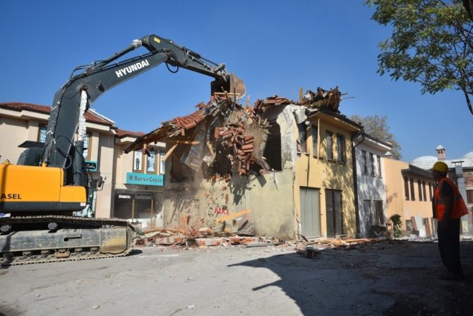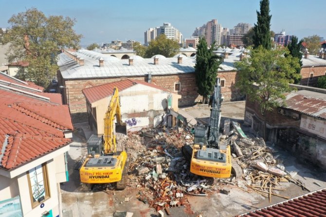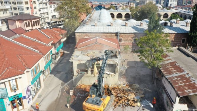 Osmanlı'nın ilk başkenti olan Bursa'da 14. yüzyılda oluşmaya başlayan, 16. yüzyılda han, bedesten ve çarşıların oluşumuyla gelişimini tamamlayan Tarihi Çarşı ve Hanlar Bölgesi'ni eski ihtişamına kavuşturacak proje etap etap ilerliyor. Bursa Büyükşehir Belediyesi'nin, Çevre ve Şehircilik Bakanlığı tarafından da desteklenen projesinde, Kızılay, İşkur, Merkez Bankası binalarının yıkımıyla 600 yıllık Ulu Cami'nin, Cemal Nadir Caddesi üzerinden de görünmesi sağlanmıştı. Ardından Pirinç Han'ın arkasındaki Bursalı Esiri Mehmet Efendi olarak bilinen 40'ıncı Osmanlı şeyhülislamına ait türbenin etrafını saran 15 dükkanın yıkımı da tamamlanmıştı. Daha sonra Pirinç Han'ın arka kısmında bulunan bir bina daha geçtiğimiz aylarda yıkılmıştı. Böylece Tarihi Çarşı ve Hanlar Bölgesi, etrafını çevreleyen binalardan arındırılarak yeniden gün yüzüne çıkmaya başladı.