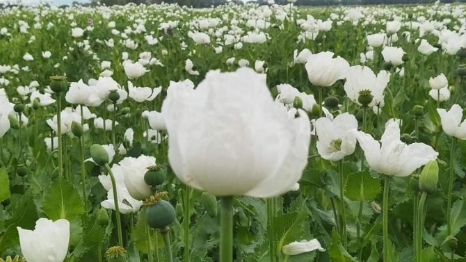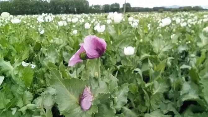 Haşhaş tarlalarında açan mor ve beyaz çiçekler görsel şölen oluşturuyor