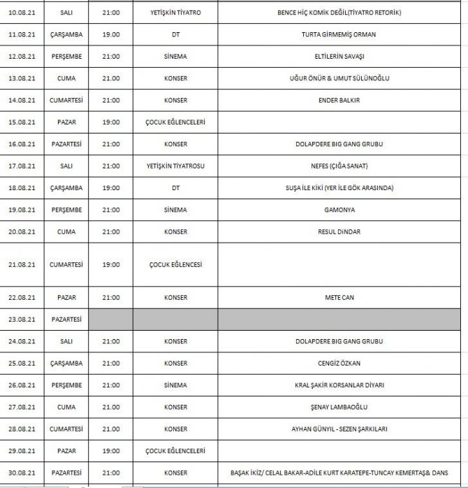 Vatandaşlar konserlerin yanı sıra düzenlenecek sinema gösterimleri, tiyatro oyunları ve çocuk eğlenceleri de keyifli zaman geçirecek. 10 Ağustos'ta Bence Hiç Komik Değil, 11 Ağustos'ta Turta Girmemiş Orman, 17 Ağustos'ta Nefes, 18 Ağustos'ta Suşa ile Kiki, 31 Ağustos'ta ise Sevgili Doktor isimli tiyatro oyunları sahnelenecek. Sinema gösterimleri kapsamında ise 12 Ağustos'ta Eltilerin Savaşı, 19 Ağustos'ta Gamonya ve 26 Ağustos'ta da Kral Şakir Korsanlar Diyarı filmleri izleyiciyle buluşacak.