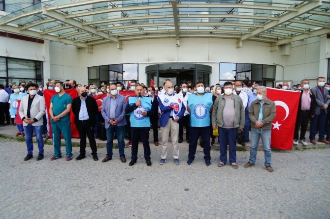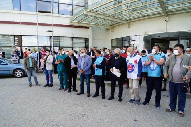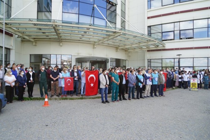 Konuşmaların ardından sağlık çalışanları, alkışlayarak yaşanan şiddet olayına tepki gösterdi.