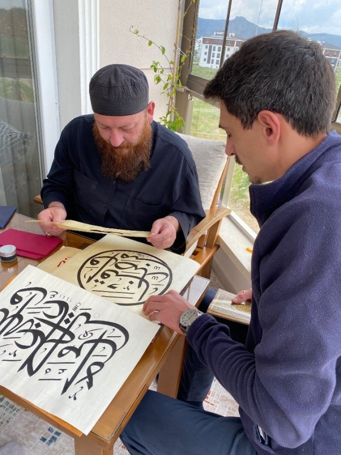 Hat sanatını öğretmek için her hafta Anadolu’yu gezen Hattat Mahmut Şahin, takip ettiği cami ve müze projelerini de sokağa çıkma kısıtlaması sebebiyle aksamaması için, çalışmaları yerlerinde kontrol e...