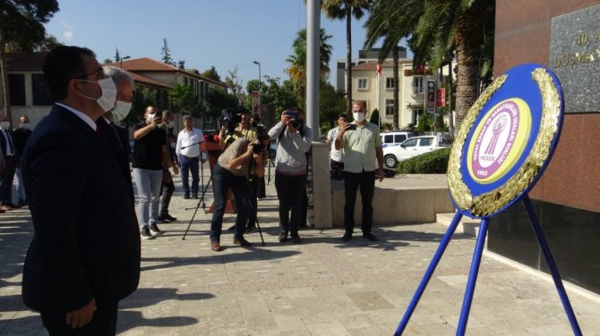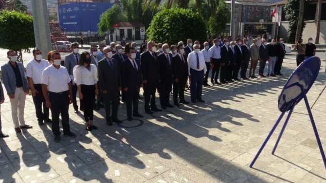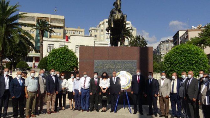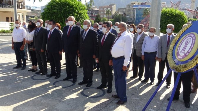 Çelenk sunma programına Hatay Ticaret İl Müdürü Halit İmrek, Antakya Belediye Başkanı İzzettin Yılmaz, Hatay Esnaf ve Sanatkarlar Odaları Birliği (HESOB) Başkanı Kadir Teksöz, oda başkanları katıldı.