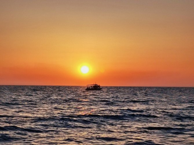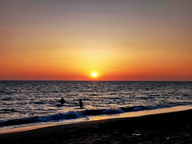 Samandağ sahilinde gün batımıyla birlikte gökyüzü kızıla büründü. Bulutların arasından yansıyan güneş ışınları görsel bir şölen oluştururken, gün batımıyla teknelerin birleşimi kartpostallık görüntüler ortaya çıkarttı.