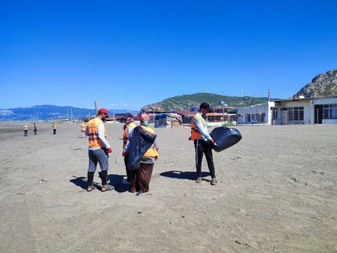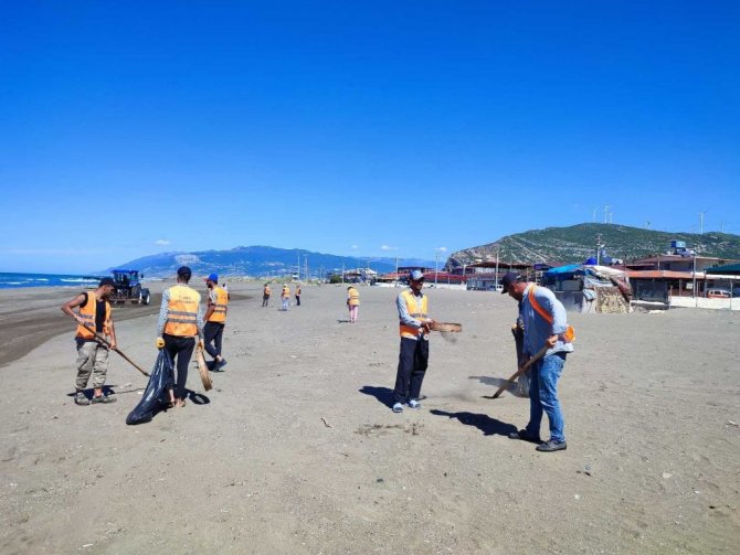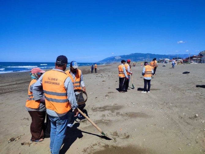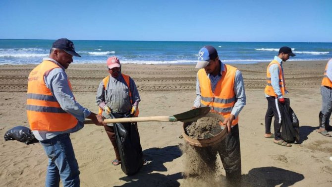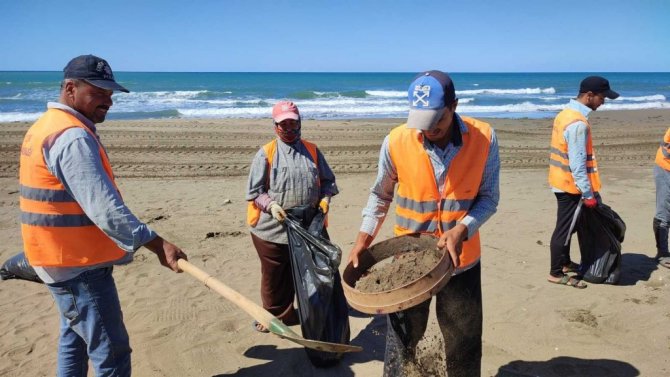 Hatay'ın Samandağ ilçesi sahillerinde Çevre ve Şehircilik İl Müdürlüğü ekipleri, 2 Eylül'de başlayan temizlik çalışmalarını sürdürüyor. 20 kişilik ekip, tırpan ve kürek kullanarak kumsaldan topladıkları atıkların kumlarını eleyip çuvallara dolduruyor. Petrol atığı toplayan işçiler türkü söyleyerek işlerini daha hızlı yapıyorlar.