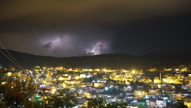 Hatay’da şimşekler rüzgar gülleri ile kartpostallık manzara oluşturdu