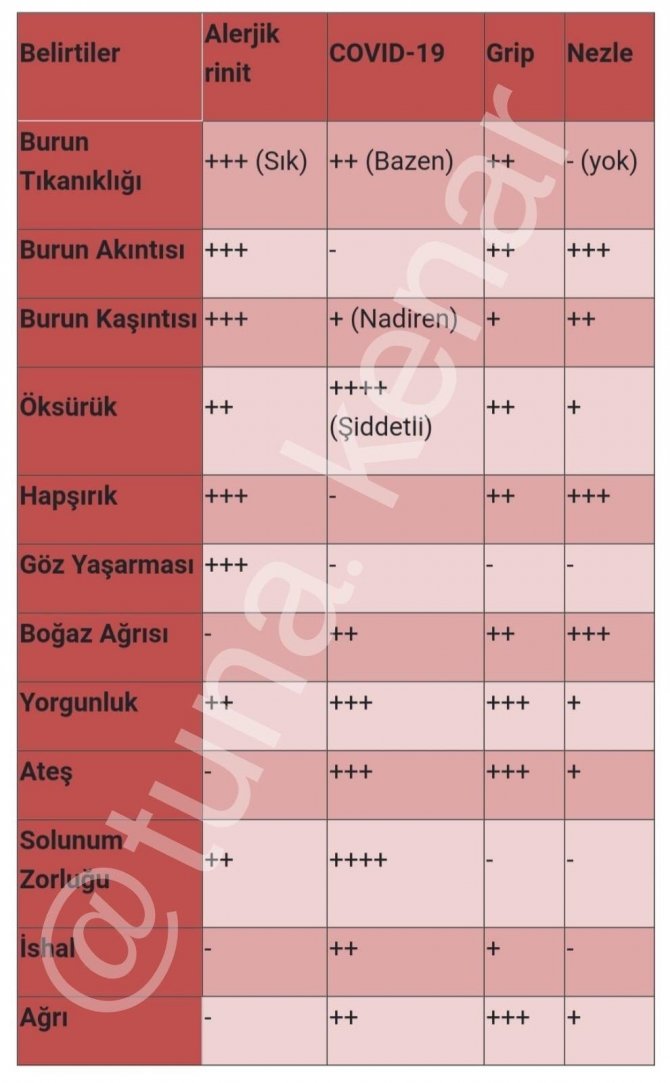 Korona virüs, grip ve nezle arasındaki farkları sıralayan Op. Dr. Kenar, "Burun tıkanıklığı, hapşırık ve kaşıntı gibi şikayetler alerjik rinitte daha fazla görülürken COVID-19 da bu semptomlar daha az görülüyor. Nezlede burun tıkanıklığı, hapşırık ve kaşıntı gibi semptomlar daha çok burun bölgesinde oluşur. Gripte ise bu şikâyetlerin üzerine tüm vücutta yaygın halsizlik, kırgınlık ve ateş ekleniyor. Nezle ile grip farkı budur. COVID-19 da semptomlar çok farklı olmakla birlikte lokal üst solunum enfeksiyonları yanı sıra yaygın halsizlik, ateş ve öksürük oluyor" ifadelerini kullandı.