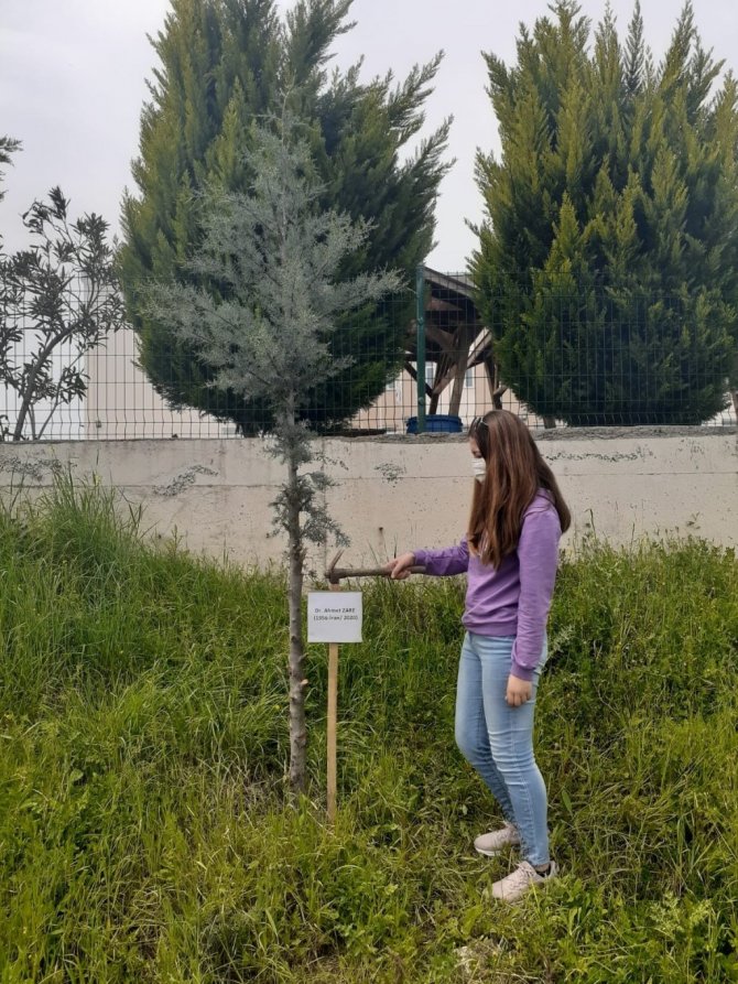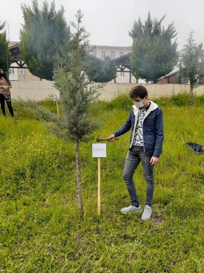 Manyas Anadolu Lisesi öğrencileri, salgınla mücadele de hayatlarını kaybeden sağlık çalışanlarının her biri adına okullarının bahçesine ve çevresine çam fidanı dikti.