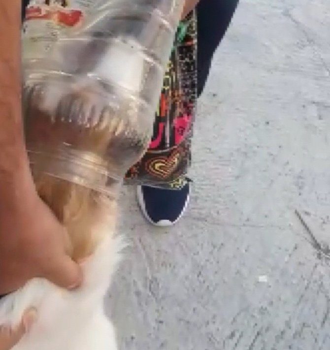 Adıyaman merkez Yeni Mahalle'de başı boş bir köpek sokakta bulduğu plastik bidona kafasını soktu. Kafasını bidondan çıkaramayan köpek, bidonla beraber bir sağa bir sola koşuşturup durdu. Bu esnada köpeğin kafasında bidon olduğunu fark eden vatandaşlar, köpeğin yanına yaklaşarak köpeği yakaladı. Bir yandan vatandaşlardan korkan bir yandan da bidondan kurtulmak isteyen köpeğin kafasındaki bidon, vatandaşlar tarafından çıkarıldı. Bidondan kurtulan sokak köpeği daha sonra bulunduğu yerden ayrıldı.