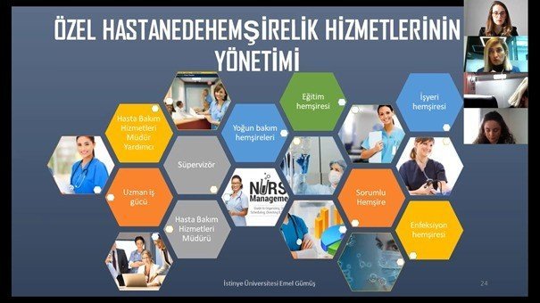 İstinye Üniversitesi Sağlık Kurumları İşbirliği Koordinatörü Emel Gümüş ise "Hemşirelik Hizmetleri Yönetimi: Özel Hastane Örneği" konulu sunumunda son dönemlerde analitik düşünme ve yenilikçilik, teknoloji tasarımı, kullanımı, aktif öğrenme, özgünlük ve inisiyatif almanın yönetim süreçlerindeki önemi hakkında bilgilendirme yaptı. Hemşirelik yönetimi sürecinden örnekler veren Emel Gümüş, öğrencilerden gelen soruları yanıtladı.