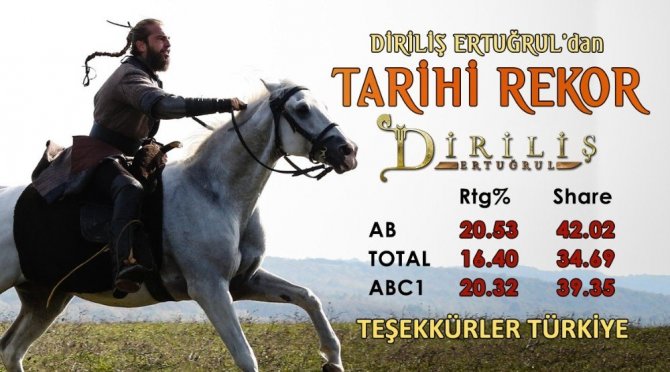 Proje Tasarımını, Yapımcılığını ve Senaristliğini Mehmet Bozdağ’ın üstlendiği, Yönetmenliğini Metin Günay’ın yaptığı Engin Altan Düzyatan, Hülya Darcan, Cemal Hünal ve Esra Bilgiç’in başrollerini paylaştığı “Diriliş Ertuğrul” Dizisi’nden bir rekor daha. Dizi, Ertuğrul’un obasına döndüğü, ’Dündar’ın ’Hanlı Pazar’ı satmasını engellediği ve Selçuklu Sultanı ’Alaaddin Keykubat’ tarafından ’Uç Beyi’ olarak ilan edildiği bölümü ile izleyicileri televizyon ekranlarına kilitledi. AB’de 20,53 reyting ve 42,02 share, ABC 1’de 20.32 reyting ve 39.35 share, TOTAL’de 16,40 reyting ve 34,69 share oranlarıyla yeni bir rekor kırdı. Reyting ve Share oranlarına göre önce ki akşam her iki kişiden biri Diriliş Ertuğrul’u izlemiş oldu.