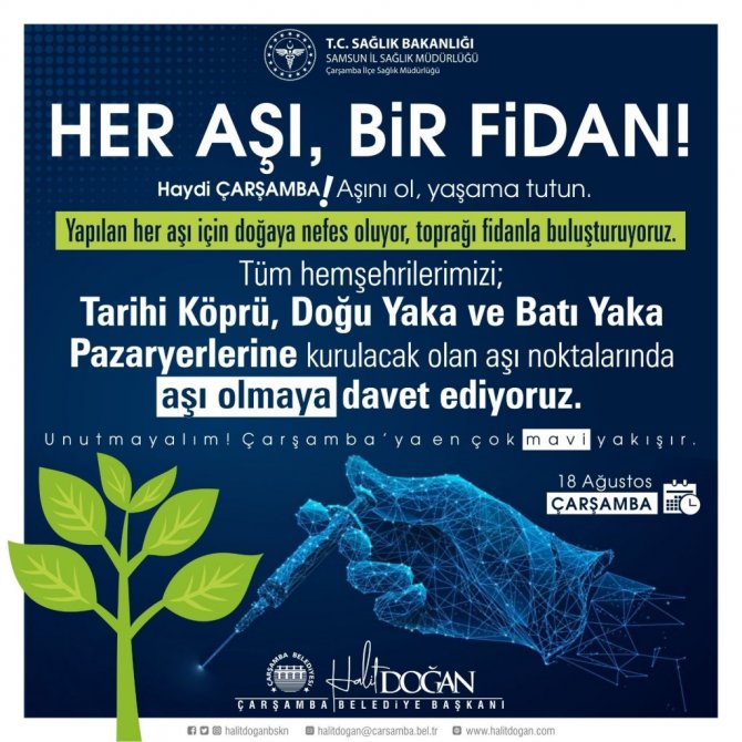 Çarşamba Belediye Başkanı Halit Doğan konuya dair yaptığı açıklamasında, "Korona virüsü yenmenin en etkili yolunun aşı olmaktan geçtiğinin bilincindeyiz. Biz de başlattığımız bu kampanya ile hem hemşehrilerimizi aşı olmaya teşvik etmek hem de doğaya bir fidan dikerek toprağımızı yeşertmek istedik. Son günlerde ülkemiz genelinde çıkan yangınlar hepimizi çok üzdü. Tüm Türkiye yangınların söndürülmesi için tek nefes olduk. Aşı kampanyamız ile toprağımızı yeşertmekte tüm hemşehrilerimizle katkımız olsun istedik. Doğaya nefes oluyor, toprağı fidanla buluşturuyoruz. Tüm hemşehrilerimiz gelip aşı olarak doğaya bir can olabilir. 18 Ağustos Çarşamba günü ilçemizin 3 noktasında aşı durakları kuracağız. Ülkemize, Samsunumuza, Çarşamba'ya en çok mavi yakışır, unutmayalım. Virüsü yenmek, yaşama tutunmak, pandemi öncesindeki yaşamımıza dönmek için aşı olmamız şart. Tüm hemşehrilerimizi aşı duraklarımıza bekliyorum" dedi.