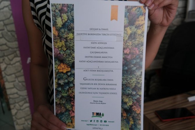 Konuyla ilgili konuşan işletmeci Yasemin Demirbilek, kendilerine gelen her müşteri için bir fidan bağışlayarak farkındalık oluşturmak istediklerini söyledi. Çiftlerin bu farkındalığın bir parçası olmaktan dolayı mutlu olduğunu belirten Demirbilek, "'Ne yapabiliriz" diye düşündük. "Davetiyede kâğıt kullanıyoruz, en azından bu kâğıtları kullandığımız için doğaya olan borcumuzu ödeyebilelim" dedik. Davetiyede kullanılan kâğıtlarımızın geri dönmesi ve gelecek nesillere yeşil bir dünya bırakabilmek için böyle bir farkındalık oluşturmak istedik. Bizi tercih eden her müşterimiz için adet, fiyat fark etmeksizin Haziran ayı boyunca fidan bağışında bulunduk. Vakıf, şu anda ağaçlandırma çalışmaları Hatay bölgesinde olduğu için orada bir fidan olarak belirtiyor. Çiftler davetiyeler ile birlikte onlar adına bağışladığımız fidan sertifikasını görünce bize memnuniyetlerini ve teşekkürlerini iletiyor" dedi.