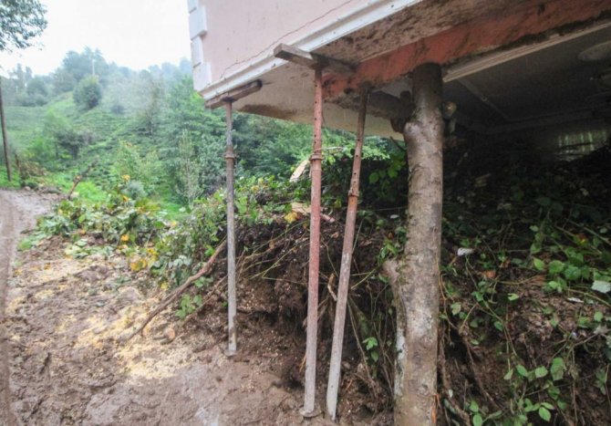 Rize'nin Çayeli ilçesinde meydana gelen heyelanda bir ev zarar gördü. Ev sahibi şahıs, zarar gören ve bir kolonu heyelanda yıkılan evinin kalan bölümünün de yıkılmaması için demir çubuklar ve odun parçaları ile evine destek yapması dikkat çekti.