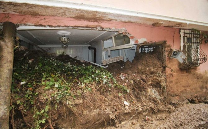Heyelan nedeniyle evinin salonu toprakla doldu