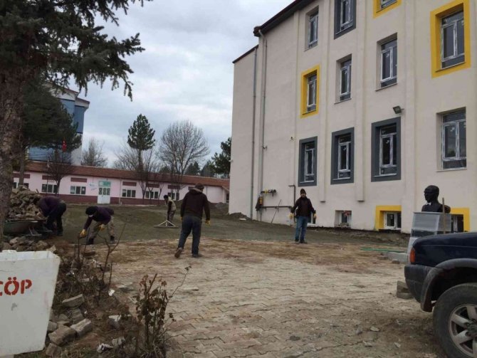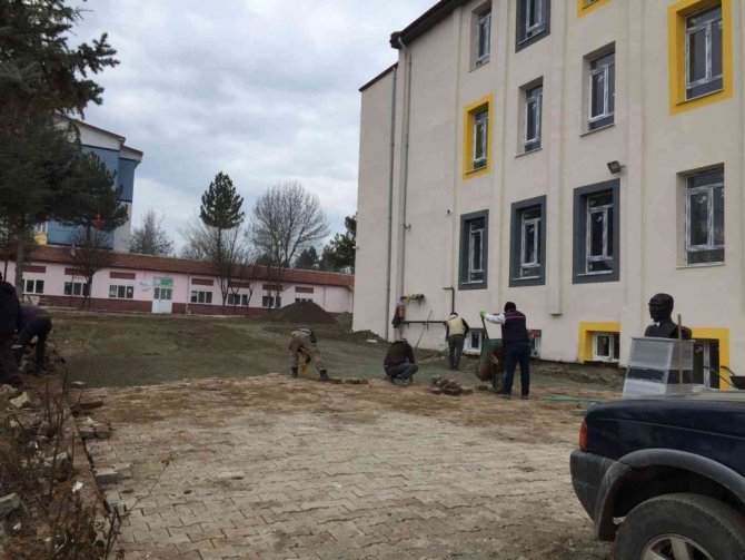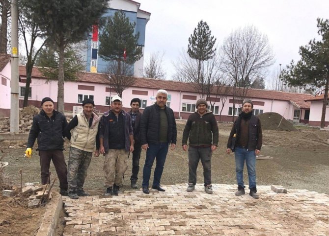 Belediye Fen İşleri ekipleri tarafından Atatürk İlkokulunun bahçesine ve okul binası çevresine yaklaşık 850 metrekare alana kilitli parke taşı döşeme yapıldı.