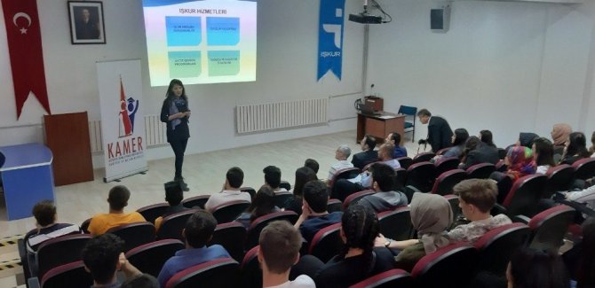 Meslek Danışmanı Neşe Ayğahoğlu öğrencilere İş olanakları, Girişimcilik Kursları, Staj Projeleri ve diğer İŞKUR hizmetleri hakkında da bilgilendirme yaptı. Bu arada öğrencilerin İŞKUR’ a kayıt olmaları sağlandı. Ayrıca Mesleki Eğitim Kursları, İşbaşı Eğitim Programları, Girişimcilik Eğitim Programları, Kendi İşini Kurma Projeleri, Çalışanların Mesleki Eğitimi, Toplum Yararına Programlar (TYP) konularında eğitimler verildi.